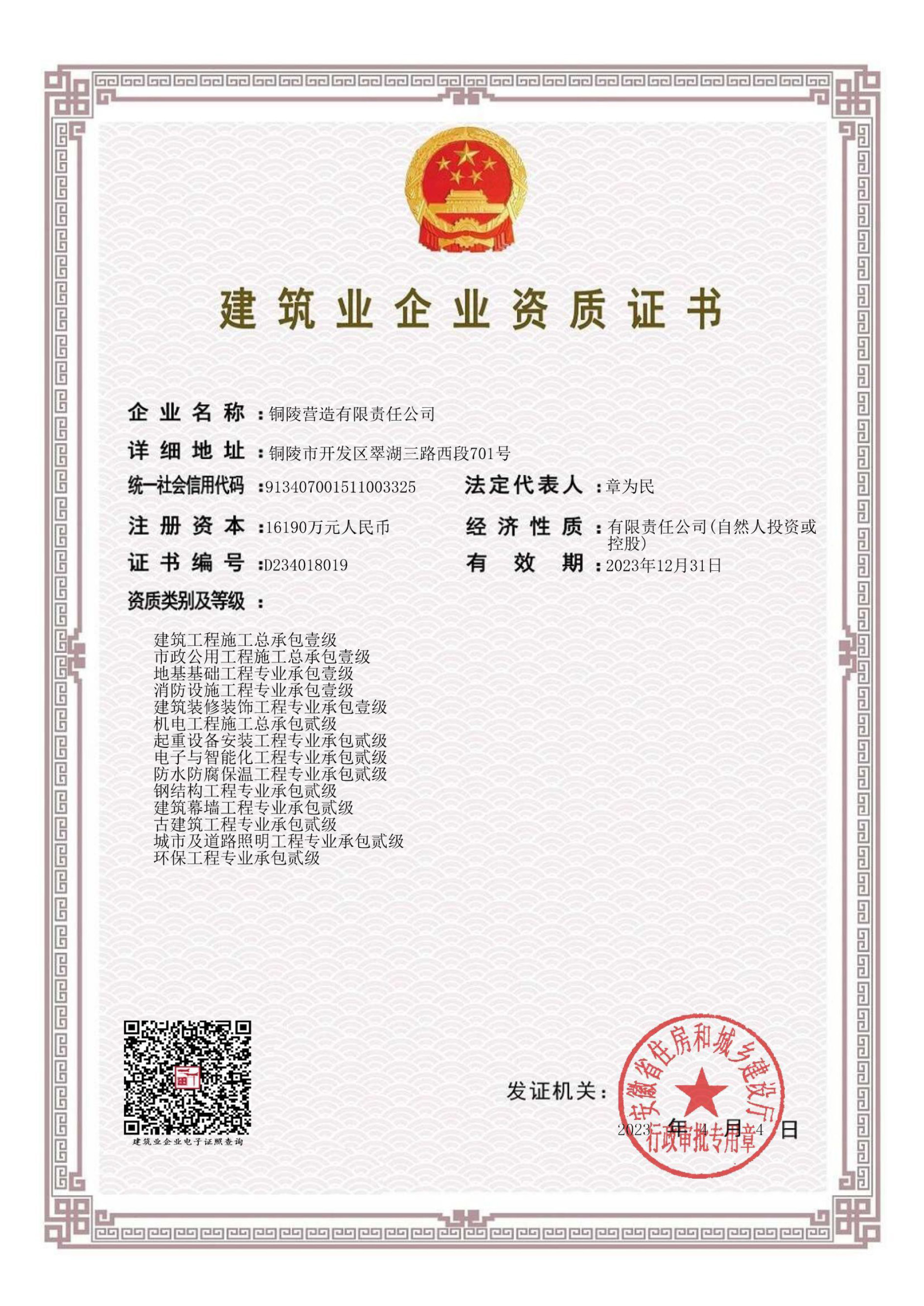 銅陵?duì)I造有限責(zé)任公司是國(guó)家住建部核準(zhǔn)的房屋建筑總承包一級(jí)企業(yè)。2006年7月,企業(yè)二次改制為民營(yíng)企業(yè),并更名為“銅陵?duì)I造有限責(zé)任公司”。目前,公司擁有房建施工總承包、市政公用工程總承包、鋼結(jié)構(gòu)專業(yè)工程承包、建筑裝修裝飾專業(yè)工程承包四項(xiàng)壹級(jí)資質(zhì),機(jī)電安裝、起重設(shè)備安裝、建筑幕墻三項(xiàng)貳級(jí)資質(zhì),地基與基礎(chǔ)一項(xiàng)叁級(jí)資質(zhì)。2008年通過(guò)北京恩格威ISO9001、ISO14001和OHSAS18001“三合一”體系認(rèn)證。
